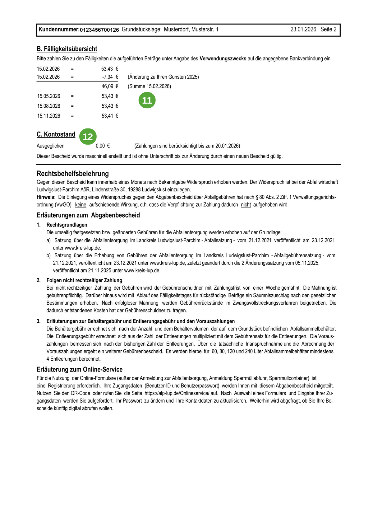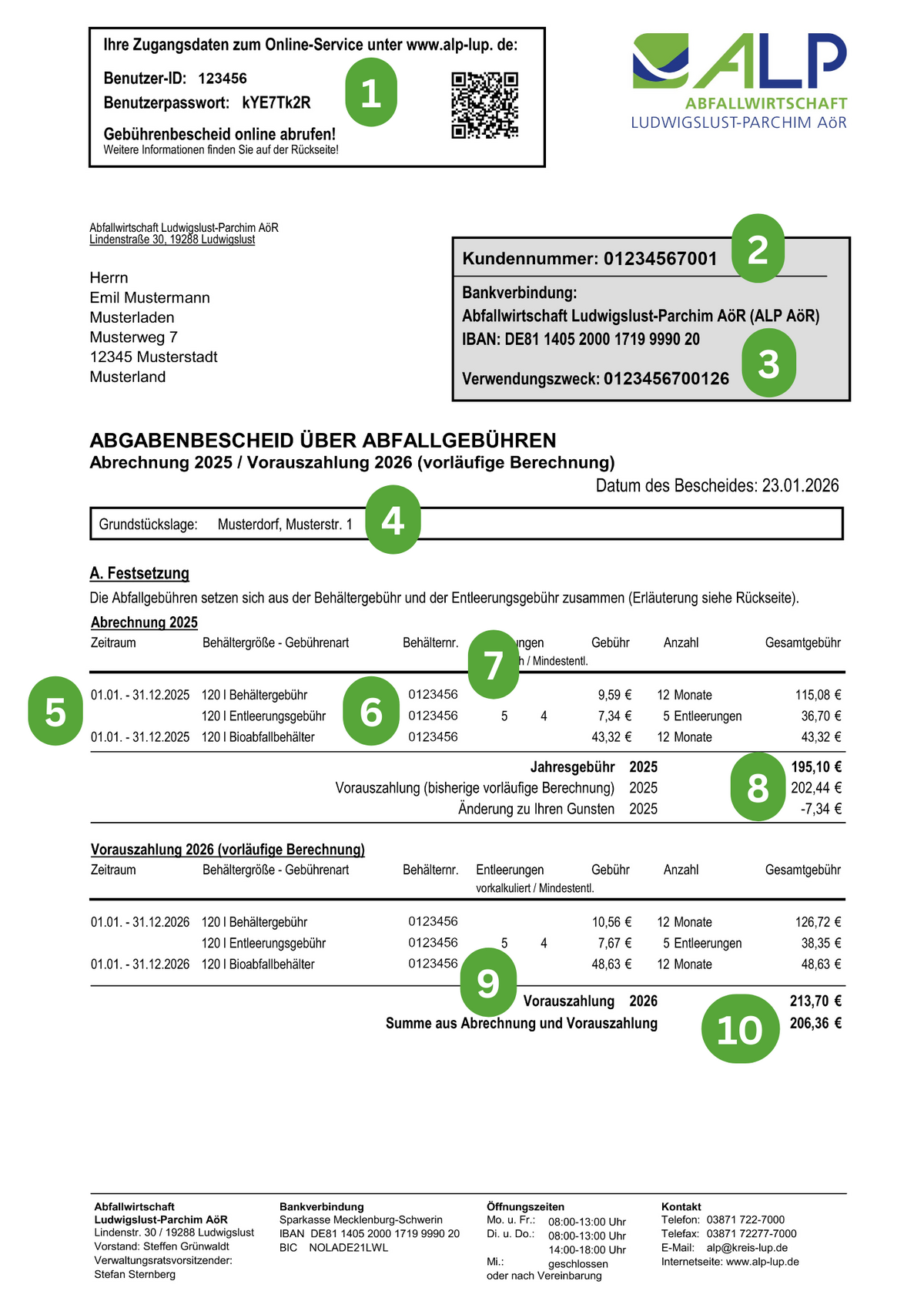 Im folgenden Abschnitt wird beispielhaft ein Jahresbescheid der Abfallwirtschaft Ludwigslust-Parchim AöR präsentiert und die wichtigsten Bestandteile näher erläutert.